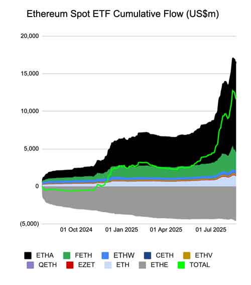 یکی از مهمترین محرکهای رشد قیمت اتریوم، بازگشت جریان سرمایه به ETFهای مبتنی بر ETH در آمریکا بوده است. تنها در تاریخ ۲۱ آگوست، این صندوقها بیش از ۲۸۷ میلیون دلار جذب کردند. در حال حاضر، ETFهای اتریوم بیش از ۱۲ میلیارد دلار دارایی تحت مدیریت دارند.