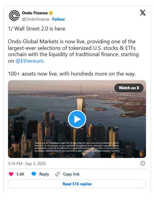 پلتفرم Ondo Global Markets توسط (Ondo Finance) و (Ondo Foundation) راهاندازی شد و بیش از ۱۰۰ سهام و ETF آمریکا را بهصورت توکنیشده روی بلاکچین اتریوم ارائه میدهد. این خدمات برای سرمایهگذاران غیرآمریکایی فعال است و بهزودی به زنجیرههای BNB و Solana گسترش مییابد.