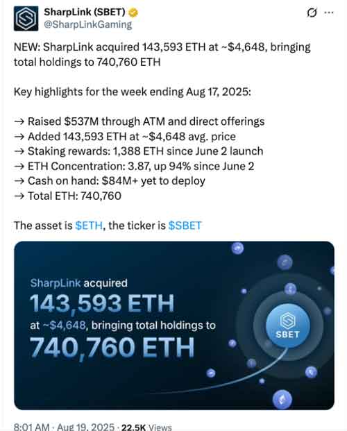 طبق گزارش ثبتشده در کمیسیون بورس و اوراق بهادار آمریکا (SEC)، شرکت شارپلینک در تاریخ اخیر ۱۴۳,۵۹۳ اتریوم را با میانگین قیمت ۴,۶۴۸ دلار خریداری کرد. این خرید کل ارزش داراییهای اتریوم این شرکت را به ۷۴۰,۷۶۰ واحد رسانده است.