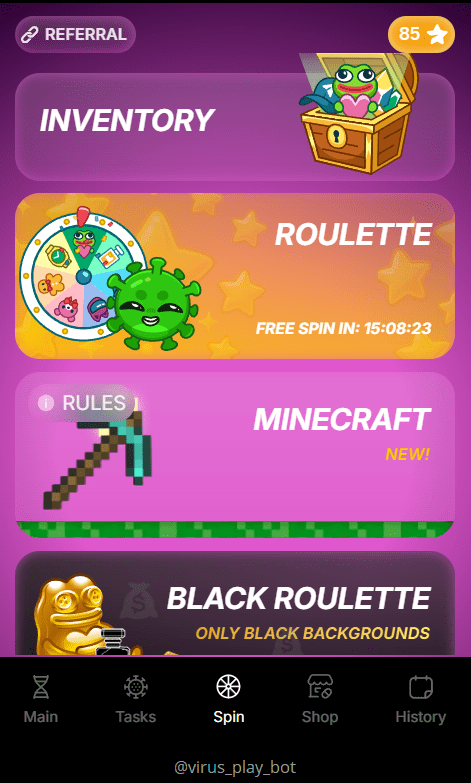 “ویروس Virus Bot” یک بازی تلگرامی است که به کاربران خود وعده میدهد با انجام ماموریتهای ساده یا خرید واکسن، به کسب درآمد برسند. در این بازی، شما باید برای زنده ماندن در بازی، توکنهای خاصی خریداری کرده و در عین حال بازیکنان جدیدی را جذب کنید. یک ربات معروف برای دریافت گیفت های رایگان و با ارزش تلگرامی است.